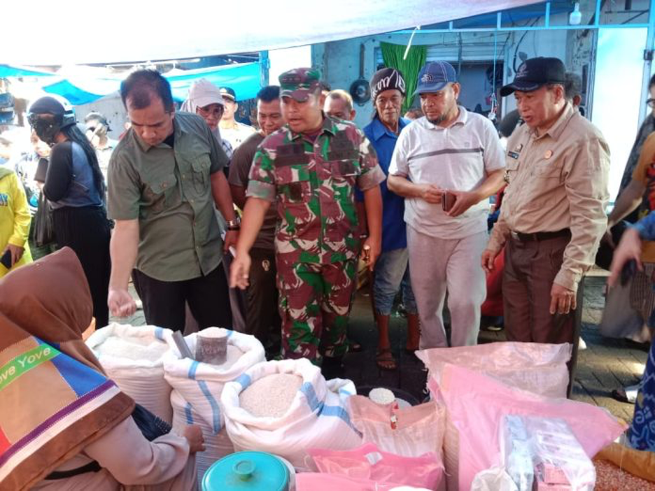 Letkol Arm Nikolas Sirilus bersama Sekda Maros, A. David Syamsuddin dan Kepala Dinas Pertanian dan Ketahanan Pangan Maros, Agustam mengecek langsung ketersediaan bahan pokok dan harganya.