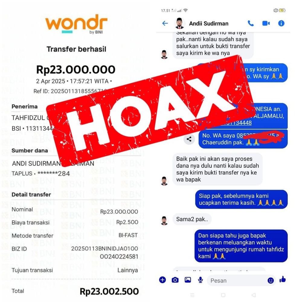 Informasi tersebut mencantumkan bukti tangkapan layar atau screenshot dari akun Facebook bernama “Andii Sudirman” yang menunjukkan transaksi transfer uang sebesar Rp23 juta.