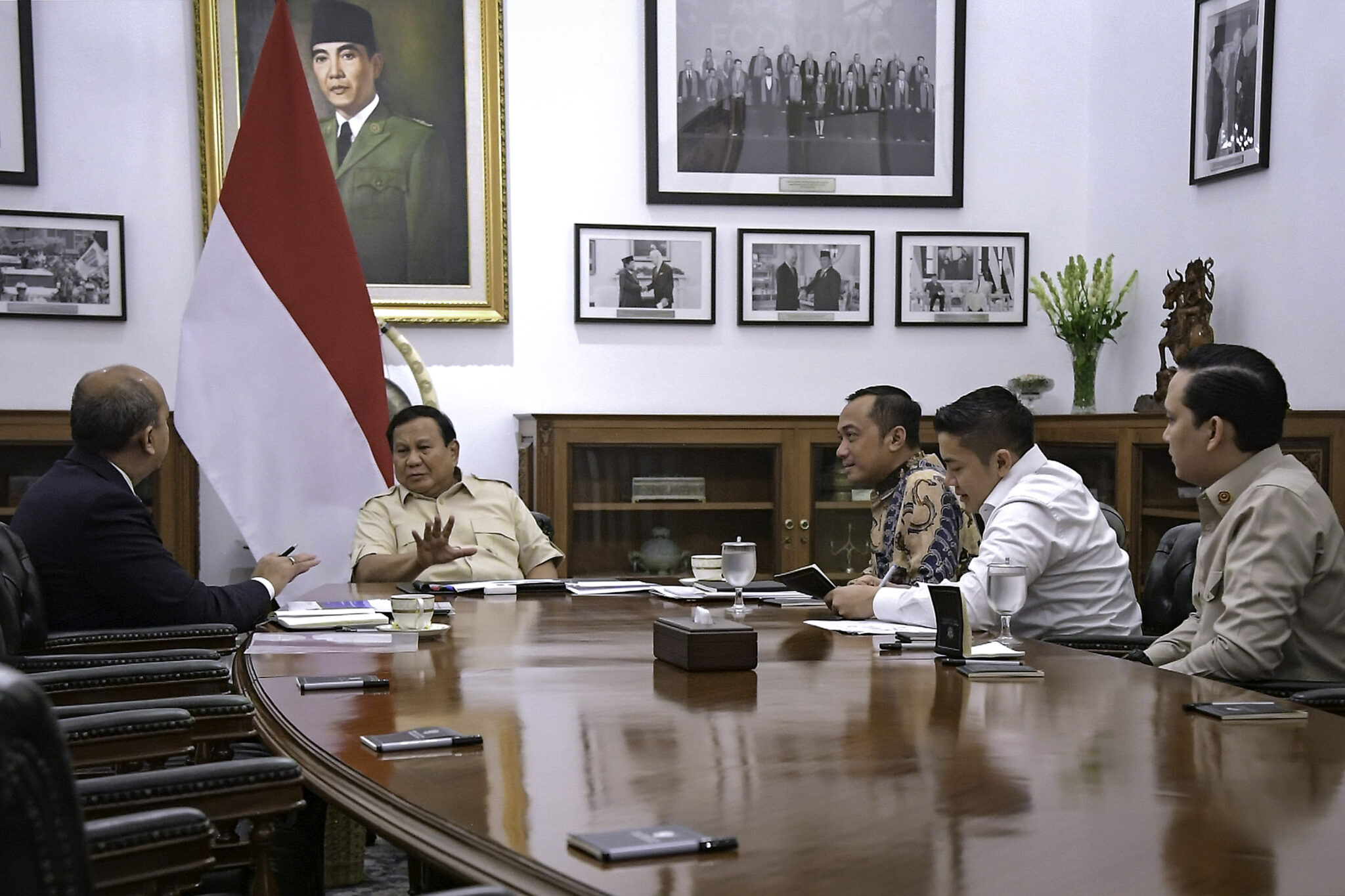 Turut hadir dalam pertemuan tersebut adalah Menteri Sekretaris Negara Prasetyo Hadi dan Sekretaris Kabinet Teddy Indra Wijaya