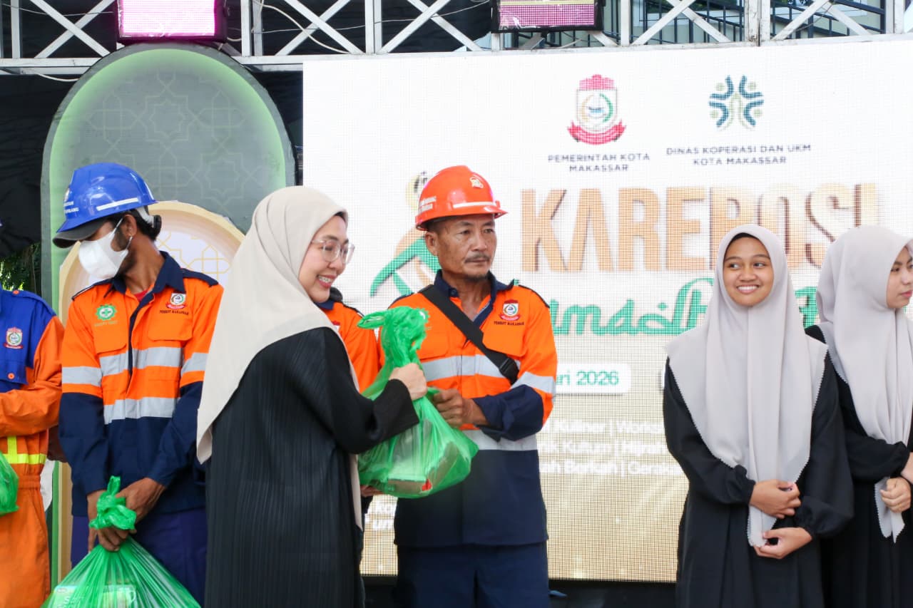 Ikonkata-Ketua Tim Penggerak PKK Kota Makassar, Melinda Aksa Munafri, menyerahkan bantuan paket sembako kepada sejumlah satuan tugas kebersihan dan panti asuhan dalam rangkaian pembukaan Karebosi Ramadan Fair di Pelataran Kanrerong, Jalan RA Kartini, Jumat (20/2/2026).